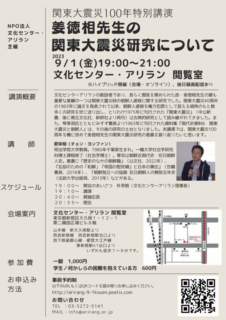 文化センター・アリランの創設者であり、長らく館長を務められた故・姜徳相先生は、朝鮮近代史研究者として朝鮮独立運動や朝鮮人学徒動員などの分野で多くの業績を残してこられましたが、なかでも最も重要な業績の一つは関東大震災時の朝鮮人虐殺に関する研究でした。関東大震災40周年の1963年に『歴史学研究』に論文を発表されて以来、朝鮮人虐殺を権力犯罪として捉える視角のもと数多くの研究を世に送り出し、とりわけ1975年に刊行された『関東大震災』(中公新書、後に青丘文化社、新幹社より再刊)は50年近くが経った今日でも古典的研究として読み継がれています。また、琴秉洞氏とともにみすず書房より1963年に刊行された資料集『現代史資料6 関東大震災と朝鮮人』は、その後の研究の土台となりました。本講演では、関東大震災100周年を機に改めて姜徳相先生の関東大震災研究の意義を振り返りたいと思います。