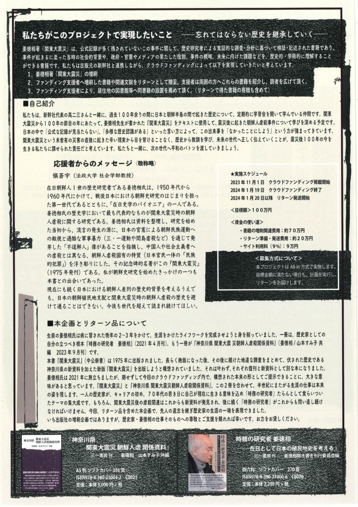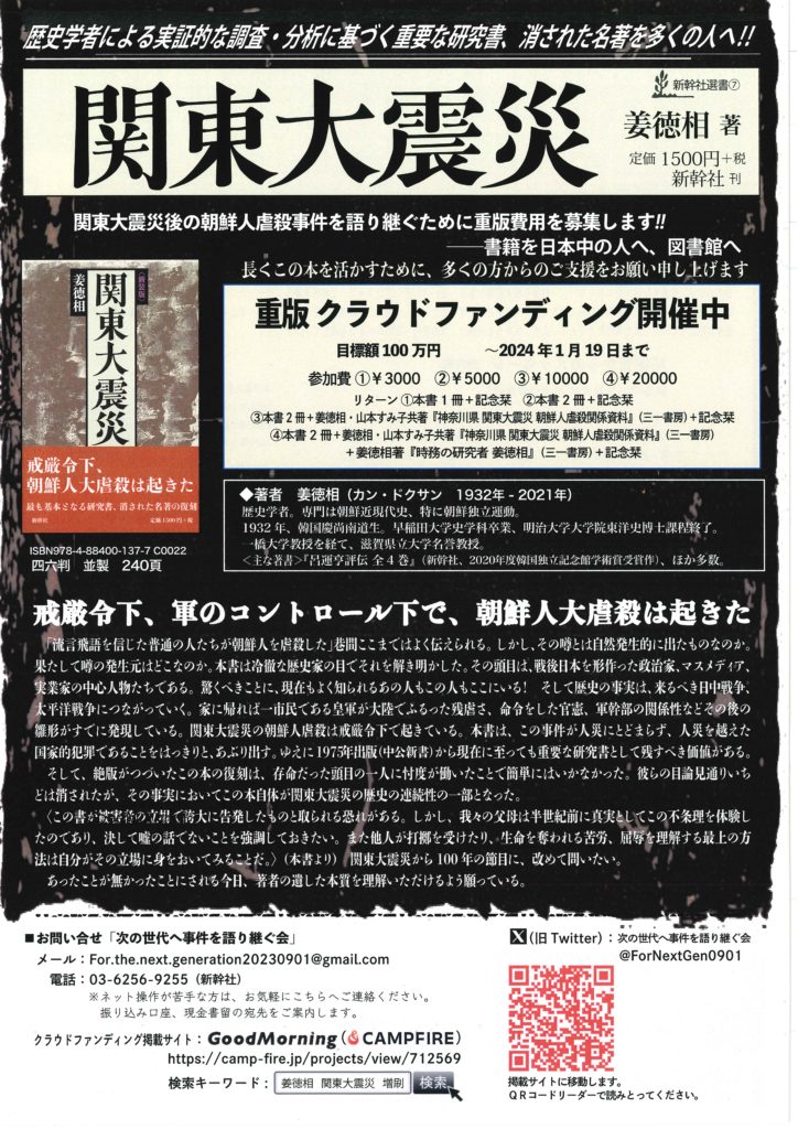 関東大震災から100年。いわれなくして殺された朝鮮人と、その事実がなかったかのように扱う日本政府や地方自治体。関東大震災の朝鮮人虐殺を語り継ぐために、絶版になってしまった姜徳相著『関東大震災』の重版費用をクラウドファンディングにて募集しております。この書籍を日本中の人が手に取れるよう、みなさまのご協力をお願いいたします。