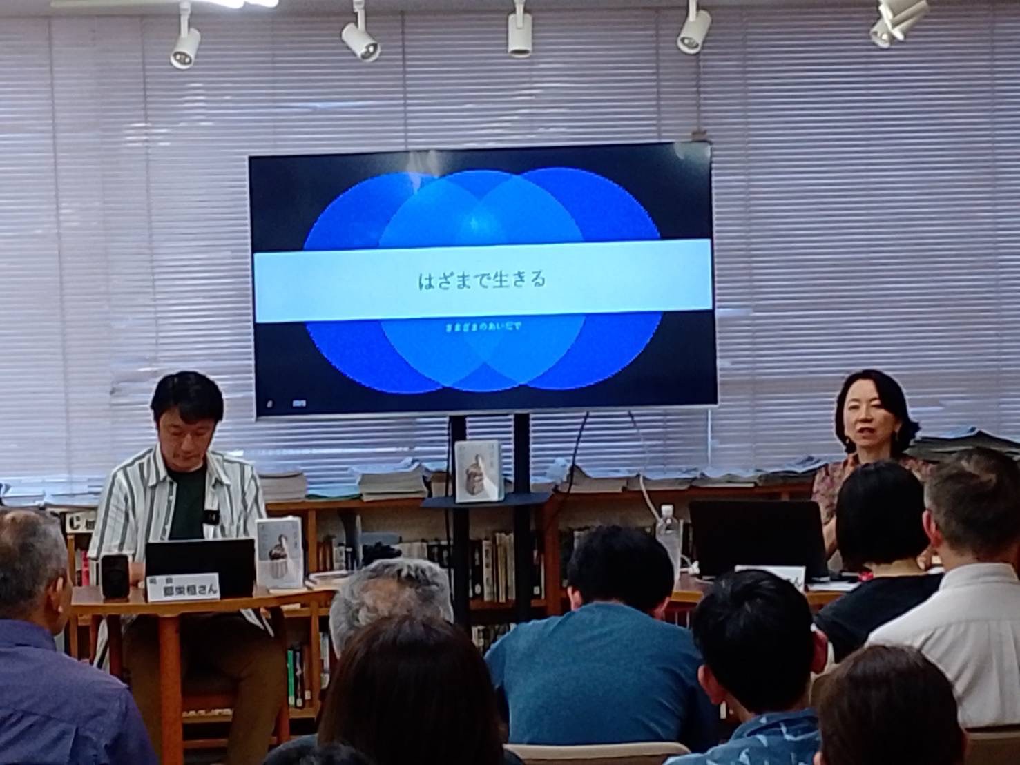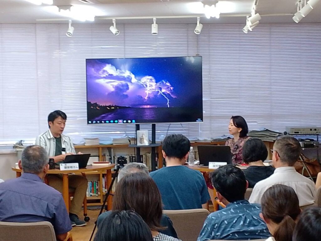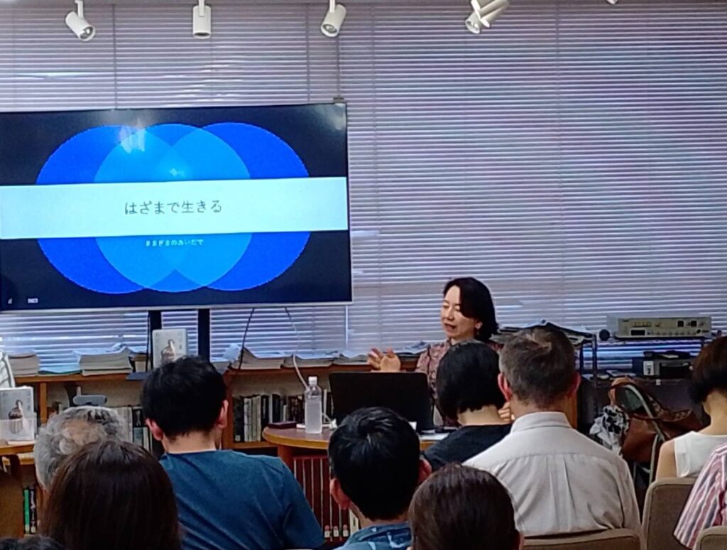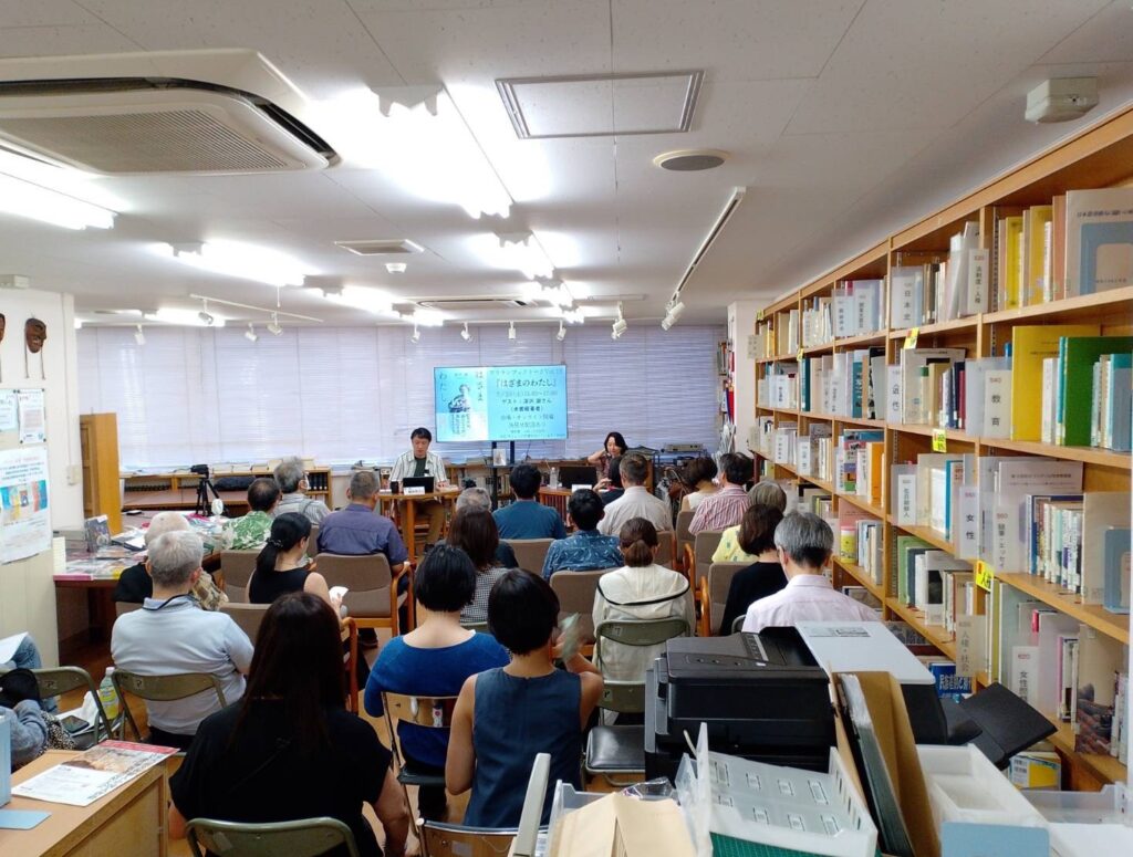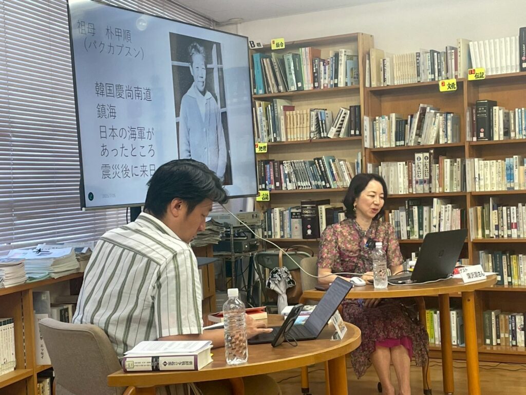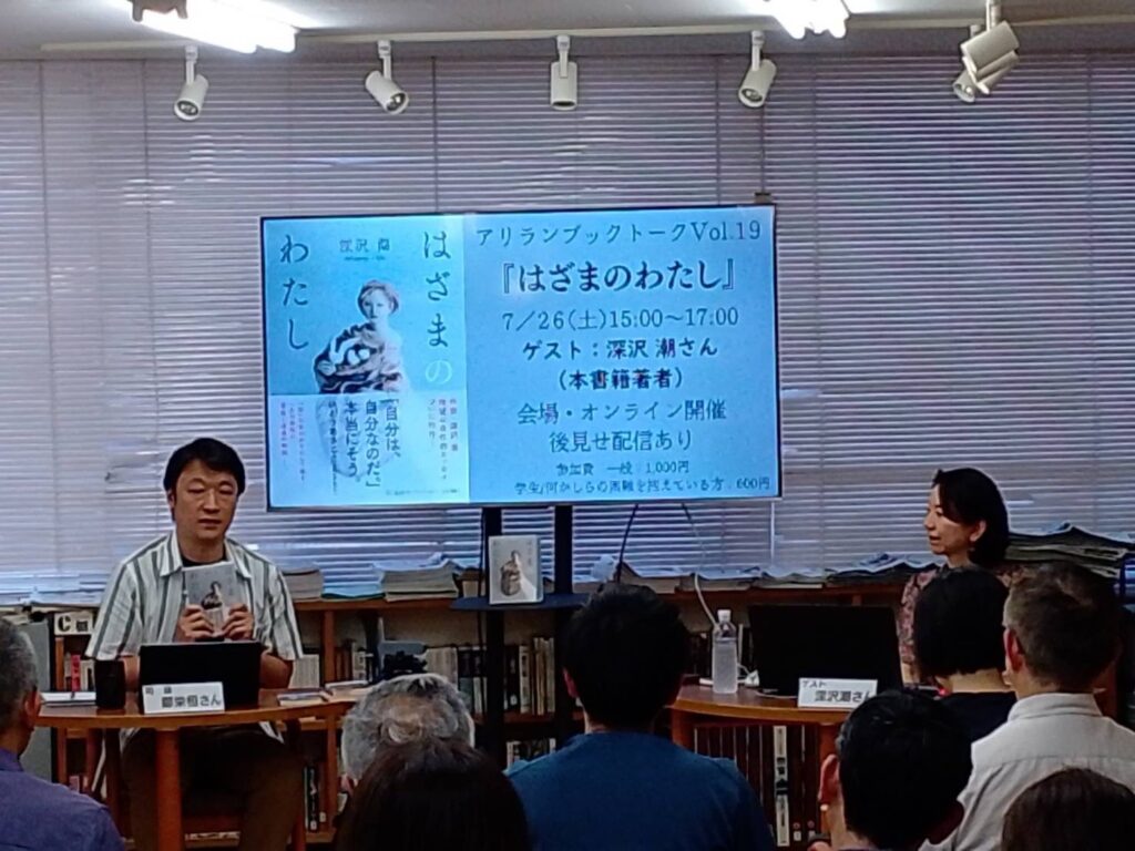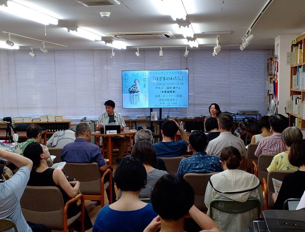 館内とオンラインのハイブリット開催でアリラン・ブックトークVol.19『はざまのわたし』を開催しました。ゲストには小説家で本書籍著者の深沢潮さんをお招きしました。会場とオンライン合わせて90名が参加しました。(2025/7/26)