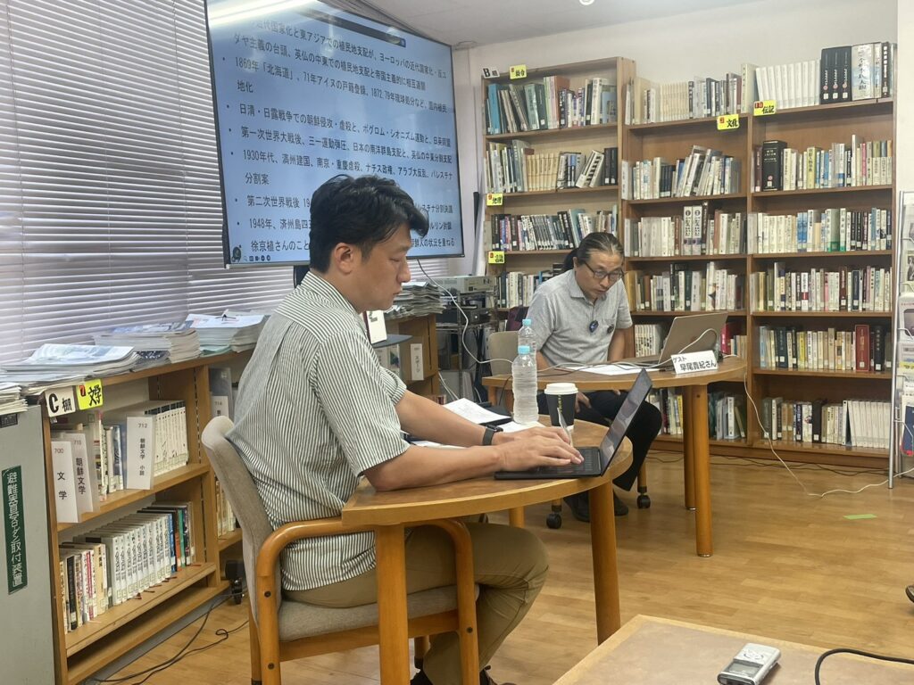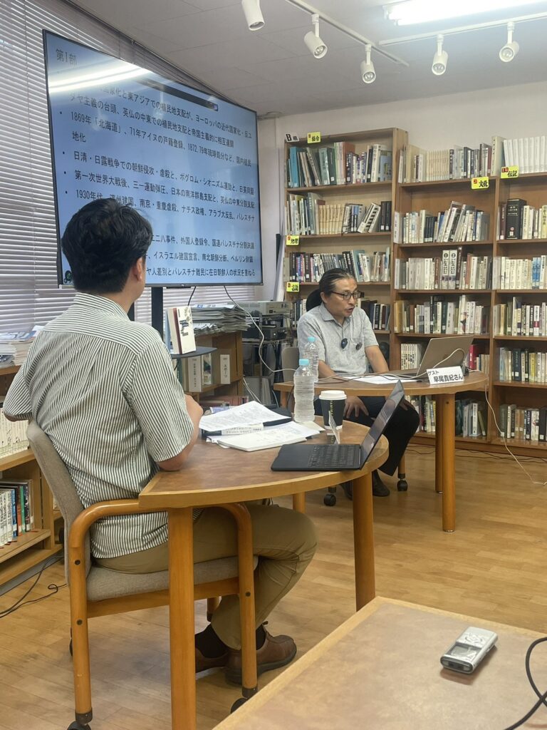 館内とオンラインのハイブリット開催でアリラン・ブックトークVol.20『パレスチナ、イスラエル、そして日本のわたしたち――<民族浄化>の原因はどこにあるのか』を開催しました。ゲストには本書籍著者で東京経済大学教員の早尾貴紀さんをお招きしました。会場とオンライン合わせて116名が参加しました。(2025/9/13)